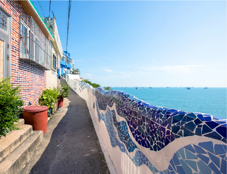絵やモザイク装飾、映画の名台詞で彩られた家々が海岸線に沿って並び、防潮堤を挟むようにして美しい釜山の海が見える景色が韓国5大海岸散歩道としても選ばれたほど。