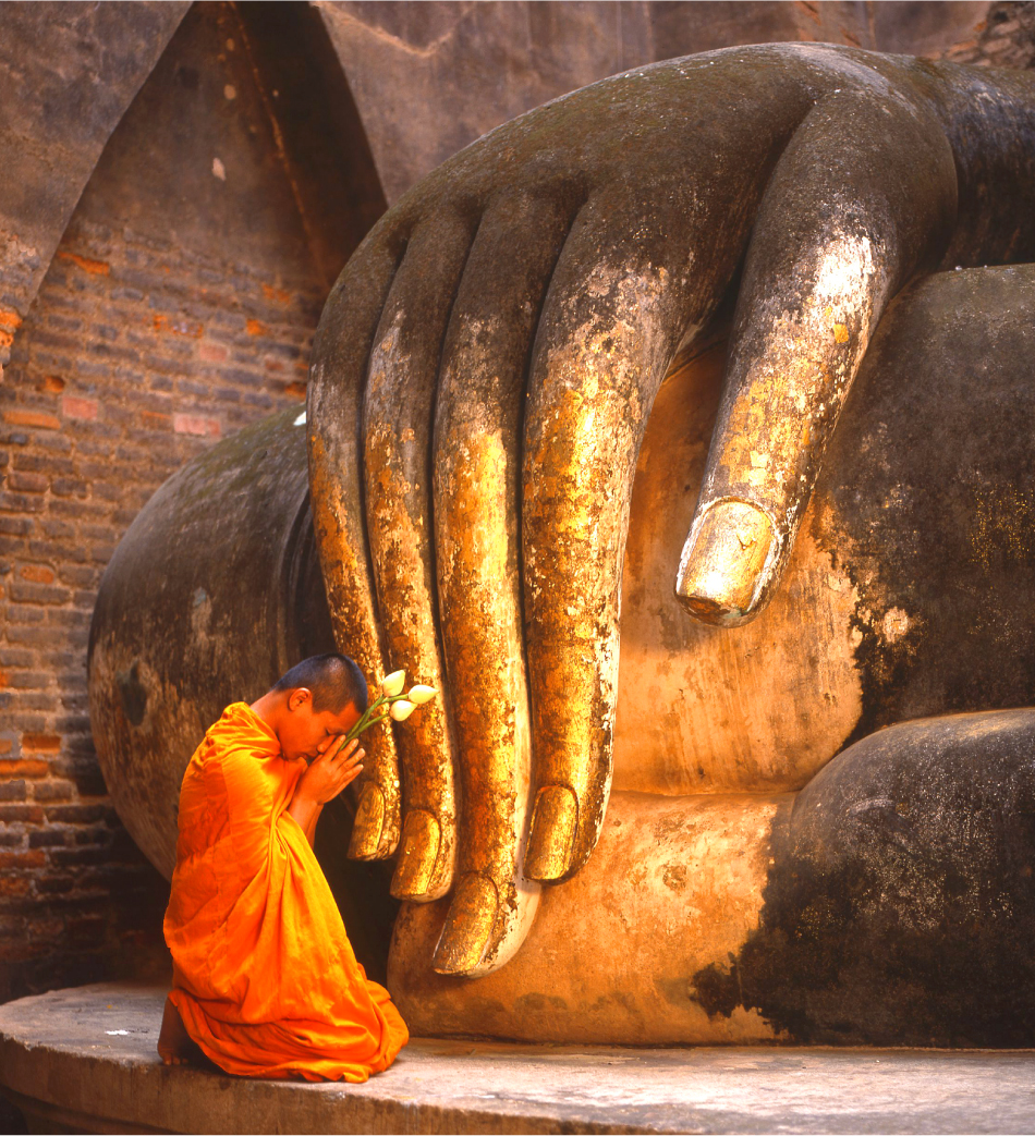 「アチャナ仏」のひざ元で祈りを捧げる僧